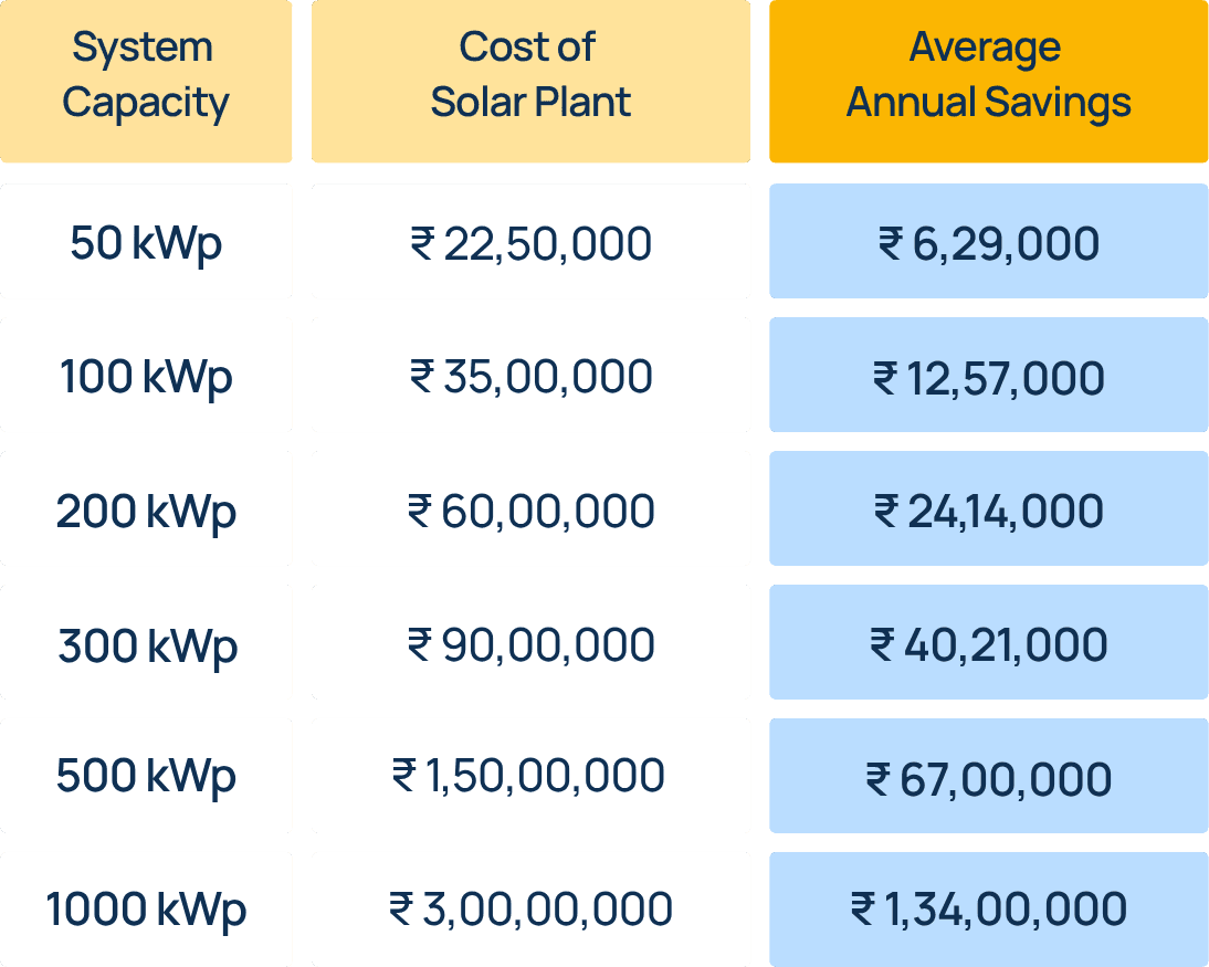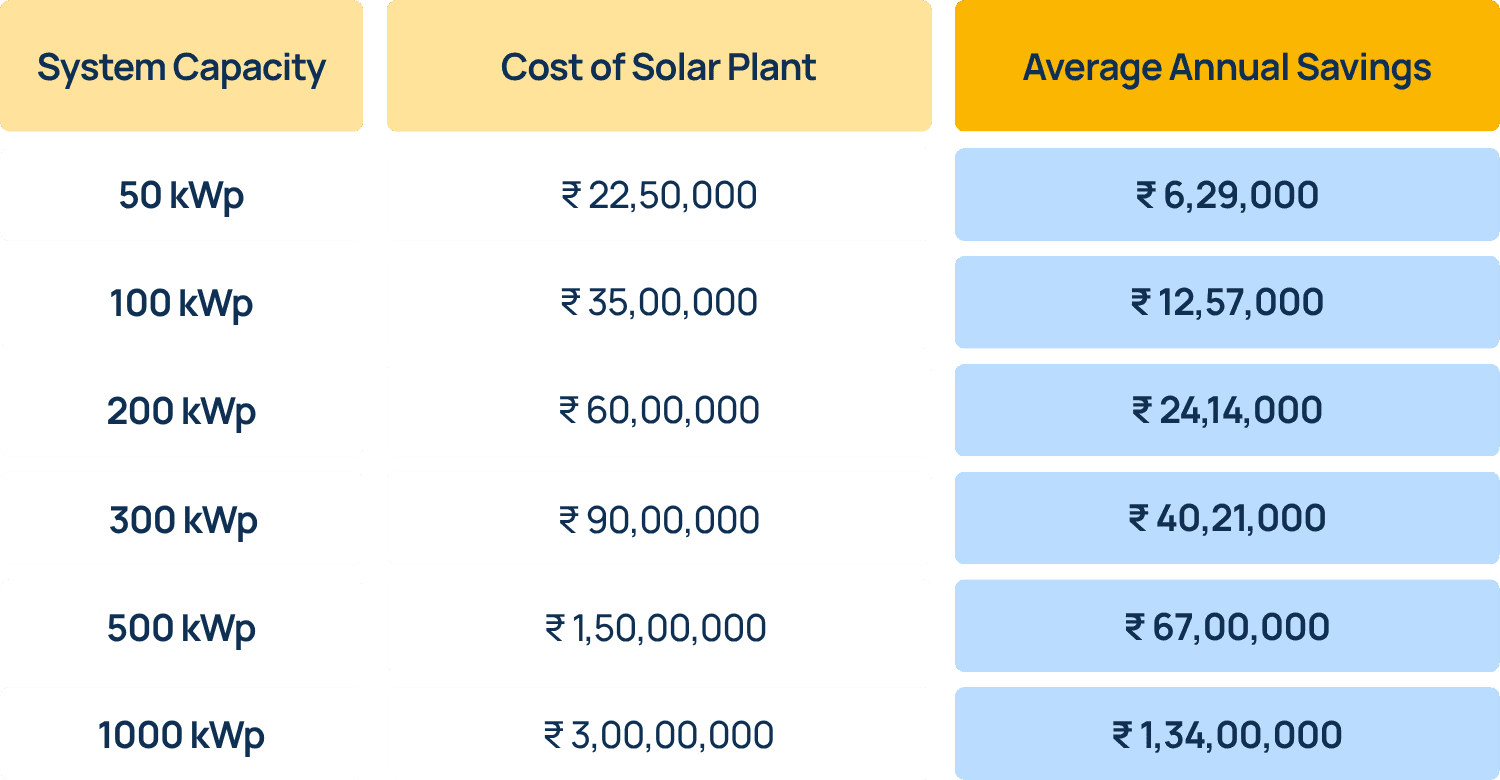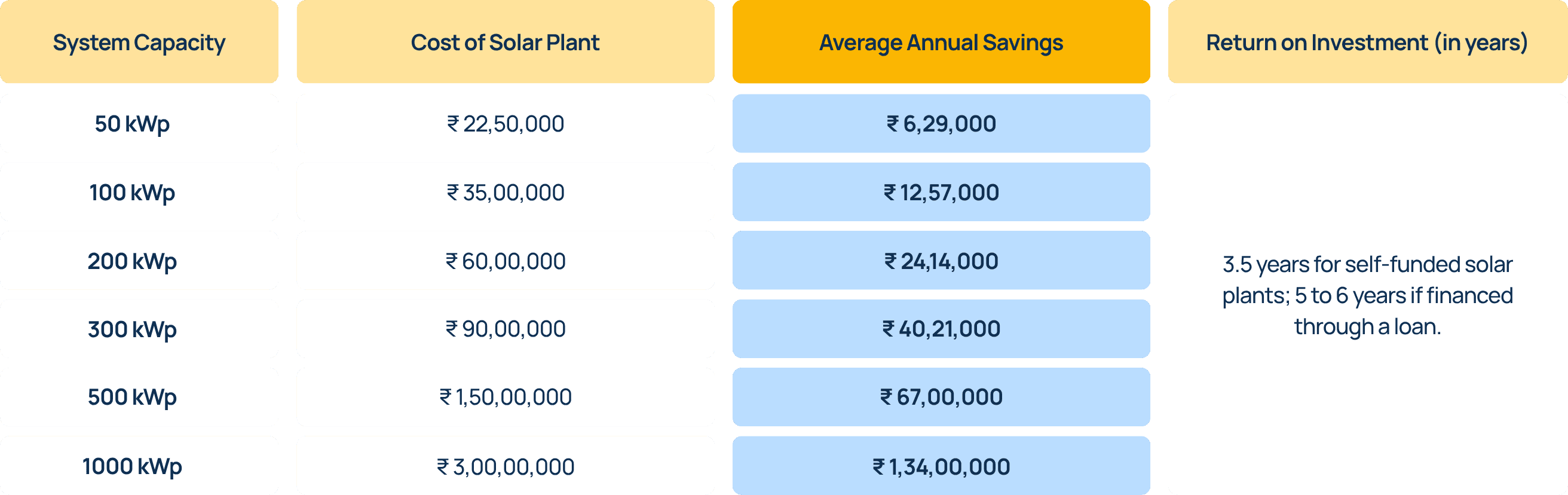 ROI: 3.5 years for self-funded solar plants; 5 to 6 years if financed through a loan.